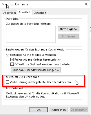 Werden geteilte Kalender nicht aktualisiert, hilft das Deaktivieren der Microsoft 365 Funktionen "Verbesserungen für geteilte Kalender aktivieren".