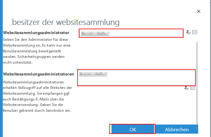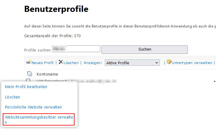 - Rechtsklick machen in der Spalte Kontoname (Es funktioniert NUR IN DER SPALTE KONTONAME!) und Websitesammlungsbesitzer verwalten auswählen: